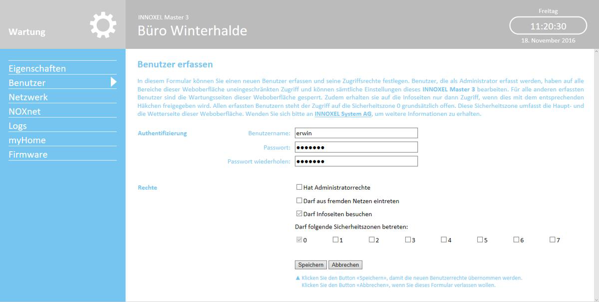 Wir empfehlen für den Zugang auf das WebUI vom "INNOXEL Master 3" oder für den Zugang der RTI Panels auf den "INNOXEL Master 3" separate Benutzer anzulegen. Nur so können Sie den Admin-Zugang geheim behalten, und sind davor geschützt, dass alle mit Zugriff auf das WebUI auch die Konfiguration ändern können.