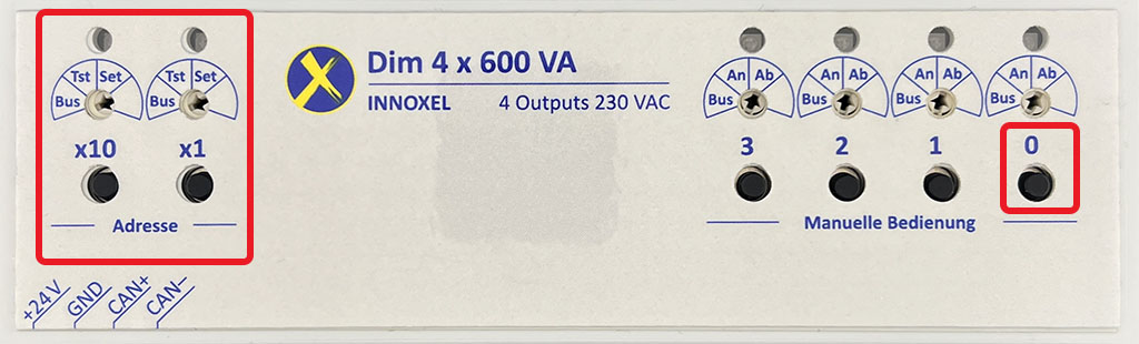Bei den INNOXEL Dim 4 x 300 VA und INNOXEL Dim 4 x 600 VA Baugruppen wird die Adresse über Taster an der Gerätefront eingestellt. Die Adressierung ist nur mit eingeschalteter 24V Stromversorgung möglich.