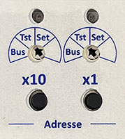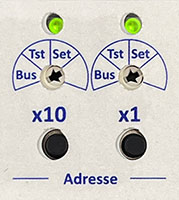 Die Adresse kann auch während des laufenden Betriebs geändert werden. In diesem Fall blinkt die rote Status-LED kurz auf, anschliessend hat die Baugruppe die neue Adresse übernommen.