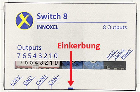 Bei den INNOXEL Switch 8 G2 Baugruppen sowie den Vorgängermodellen INNOXEL Switch 8 und NOXswitch-0806 wird die Adresse über Drehcodierschalter eingestellt. Diese befinden sich hinter der Frontblende. Um diese hoch zu klappen, nehmen Sie einen kleinen Schraubenzieher, setzen ihn vorsichtig unten an der Einkerbung der Frontplatte an und hebeln leicht nach vorne: