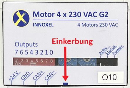 Bei den INNOXEL Motor 4 x 230 VAC G2 und INNOXEL Motor 4 x 24 VDC G2 Baugruppen sowie den Vorgängermodellen INNOXEL Motor 4 x 230 VAC, INNOXEL Motor 4 x 24 VDC und NOXmotor-0406 wird die Adresse über Drehcodierschalter eingestellt. Diese befinden sich hinter der Frontblende. Um diese hoch zu klappen, nehmen Sie einen kleinen Schraubenzieher, setzen ihn vorsichtig unten an der Einkerbung der Frontplatte an und hebeln leicht nach vorne: