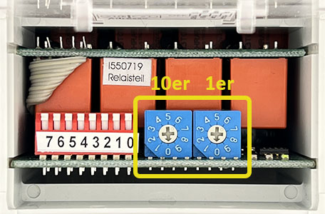 Rechts sehen Sie zwei blaue Drehcodierschalter. Das Pfeilsymbol auf jedem Schalter zeigt die aktuell eingestellte Ziffer an: